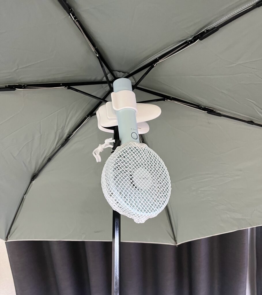 傘を閉じたり開いたりする太い部分に何とか取り付けることはできましたが、傘に付けるとハンディファンの重みを感じました。