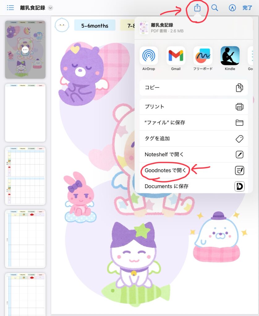 シェアボタンを押すと、Goodnotesで開くが出てくのでボタンを押します。